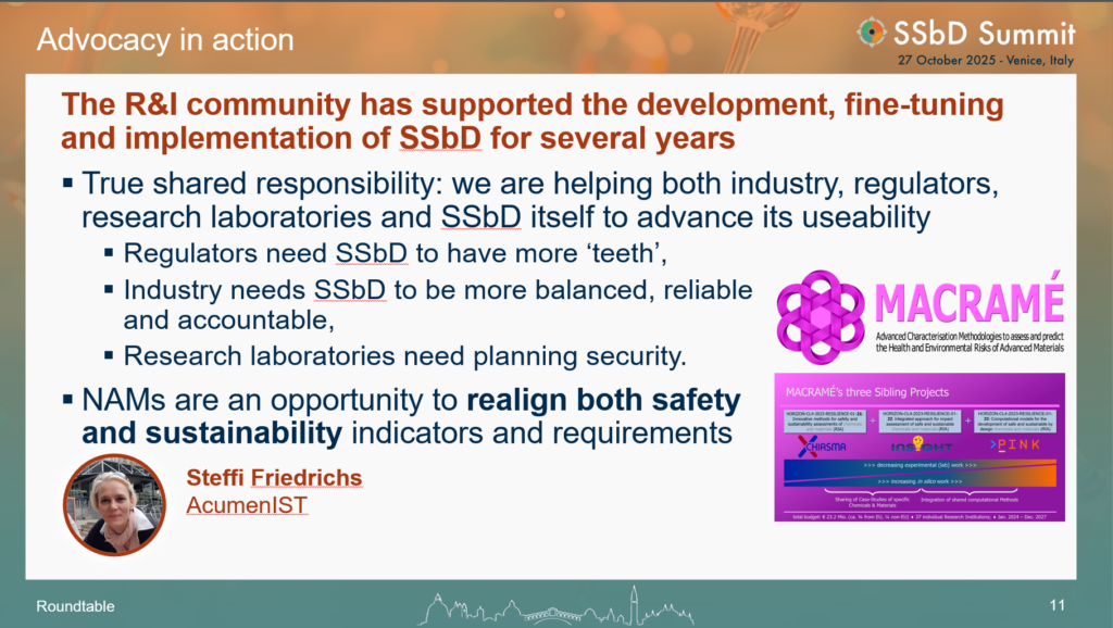 Steffi Friedrichs from AcumenIST presented the projects MACRAMÉ, CHIASMA, INSIGHT and PINK, and discussed their research approaches and results under the topic of ‘Regulatory Research for Safety & Sustainability in the EU – Advancements of international Harmonisation & Standardisation Approaches and NAMs‘.