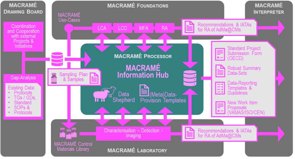 In the paper entitled ‘MACRAMÉ – Advanced characterisation methodologies to assess and predict the health and environmental risks of advanced materials‘, the authors describe the planned information-flow between the different R&I activities conducted in the Project (see Figure 1).