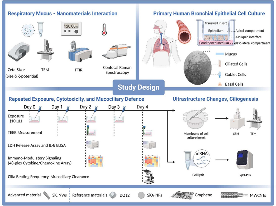 Study Design: interactions of nanomaterials (SiC NWs, SiO2 NPs, Graphene nanosheets, MWCNTs) and Crystalline Silica (Quartz DQ12, Reference Particle) with respiratory mucus followed by characterization using a range of biophysical analytical approaches. (Source: ACS Nano 2025, 19, 23, 21426-21445)