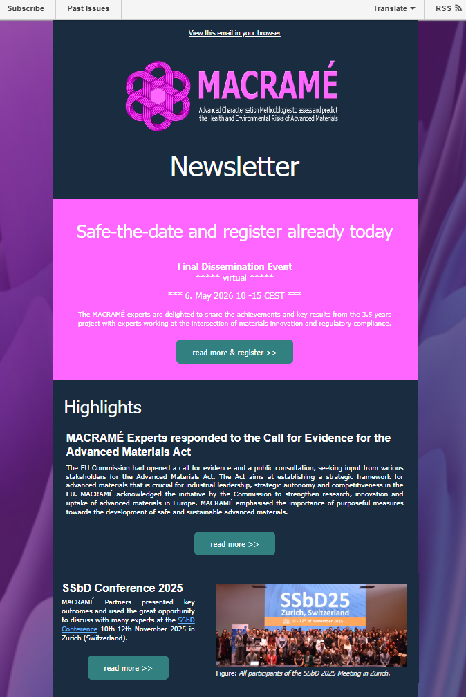 Continuing the NanoHarmony NANOMET journey: Harmonisation & Standardisation of Test Methodsfor Nanomaterials and Advanced Materials– Where did our research projects get us, and where do we go from here? *** ONLINE *** 3rd & 4th November 2025 The Horizon Europe projects MACRAMÉ, iCARE, nanoPASS and DESIDERATA invite you to an exclusive